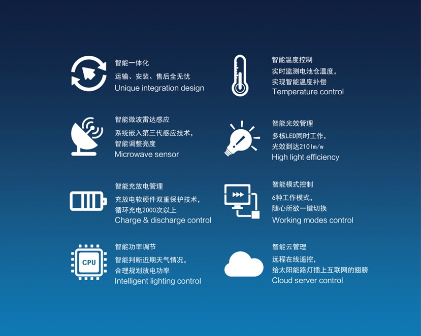 源碼不僅在產(chǎn)品的核心配件上追求高標(biāo)準(zhǔn),在研發(fā)的技術(shù)領(lǐng)域更是引先于行業(yè)。源碼太陽(yáng)能智慧路燈搭載了智能監(jiān)測(cè)與控制系統(tǒng),集智能一體化、智能微波雷達(dá)感應(yīng)、智能充放電管理、智能功率調(diào)節(jié)、智能溫度調(diào)節(jié)、智能光效管理、智能模式控制、智能云管理八大核心技術(shù)為一體,通過(guò)核心技術(shù)的組合工作,使路燈更加智能化,有效延長(zhǎng)了太陽(yáng)能路燈的壽命,達(dá)到最佳照明效果。
